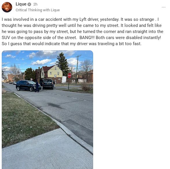My Lyft Driver Car CrashLiqueMar 13, 2026∙ Paid772ShareThis post is for paid subscribersSubscribeAlready a paid subscriber? Sign inPrevious